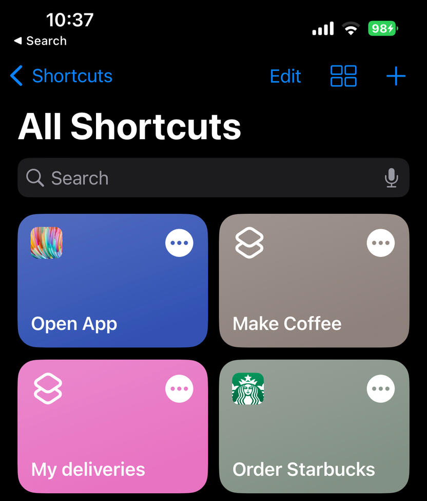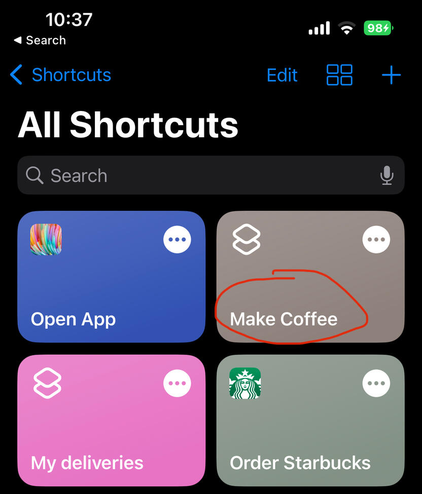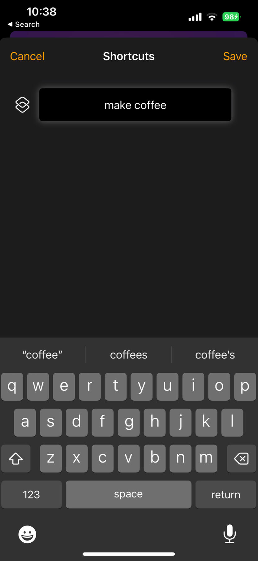 Type in the name of the shortcut you noted from earlier. Make Coffee