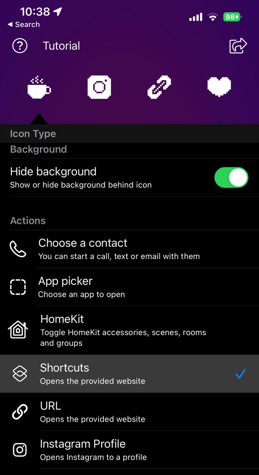 Note the name of the shortcut you want to use in for your Top Four action. In this case we'll be using Make Coffee